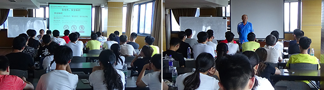 首先是安全教育,安全工程师从用电安全知识、安全“七防”、灭火器等七个方面对同学们进行实习过程中的安全教育。其次,人力资源负责人从企业基本情况、企业发展、企业文化、企业责任等方面进行了介绍,特别结合企业情况,从企业需要什么样大学生?职业素养要求,学习能力培养、创新能力培养,理论与实践结合,做有价值的大学生等方面,对同学们进行了职业规划和就业指导。