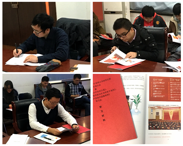 按照学校党委对“两学一做”学习教育中召开专题组织生活会和开展民主评议党员的具体要求,太阳集团tcy8722博士系统党支部、15级硕士系统党支部于2016年12月28日上午,在六号楼三层会议室召开第一环节工作,集体学习习近平总书记在党的十八届六中全会和在全国高校思想政治工作会上的重要讲话精神、《关于新形势下党内政治生活的若干准则》(以下简称《准则》)和《中国共产党党内监督条例》(以下简称《条例》)。太阳集团tcy8722院长助理、支部理论学习导师柴森春副教授,博士系统党支部、15级硕士系统党支部全体党员参加了学习。本次会议由博士系统党支部书记关子霄主持。