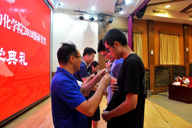 在浑厚的北京理工大学校歌声中,学院领导和教师为2018级研究生代表佩戴校徽。