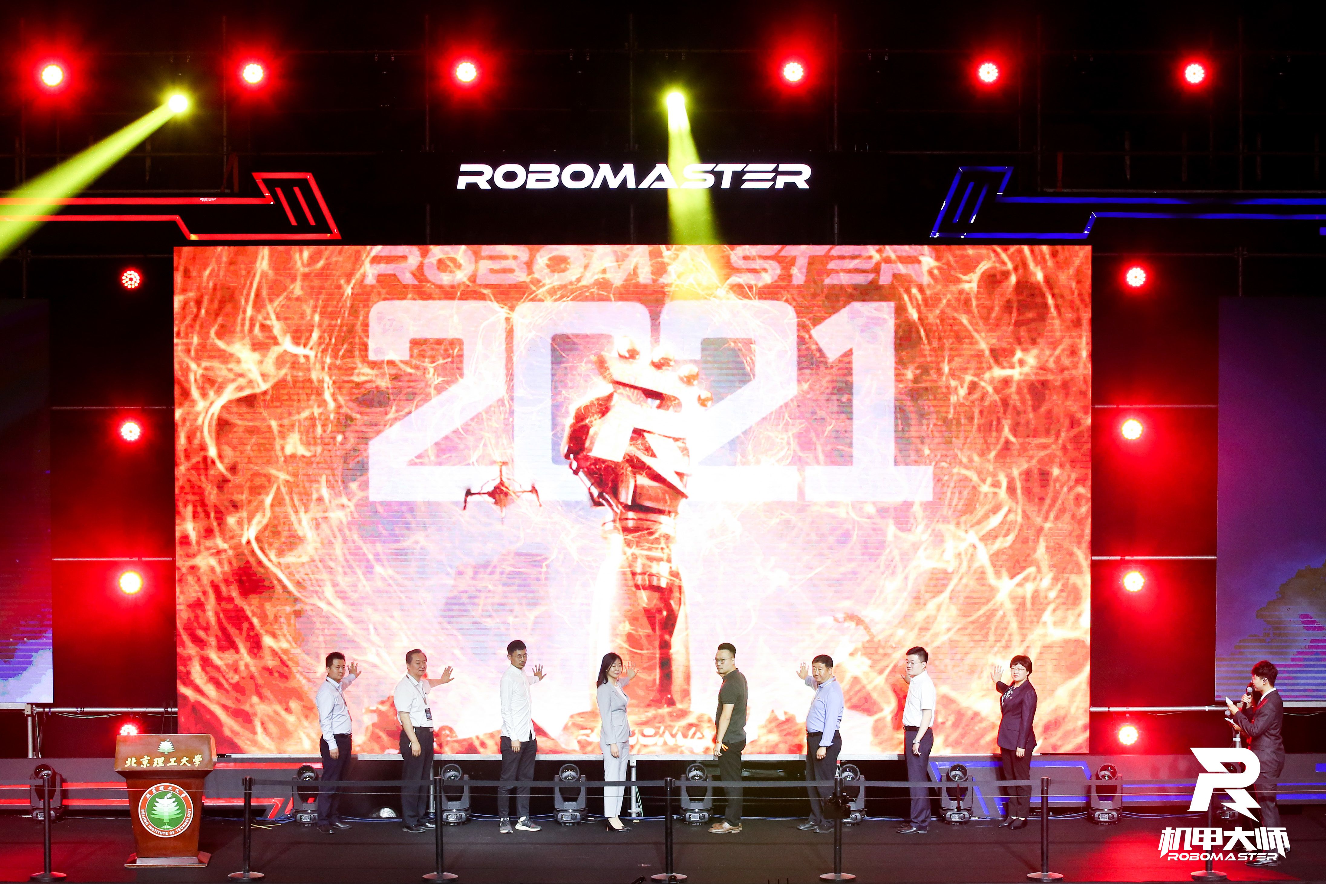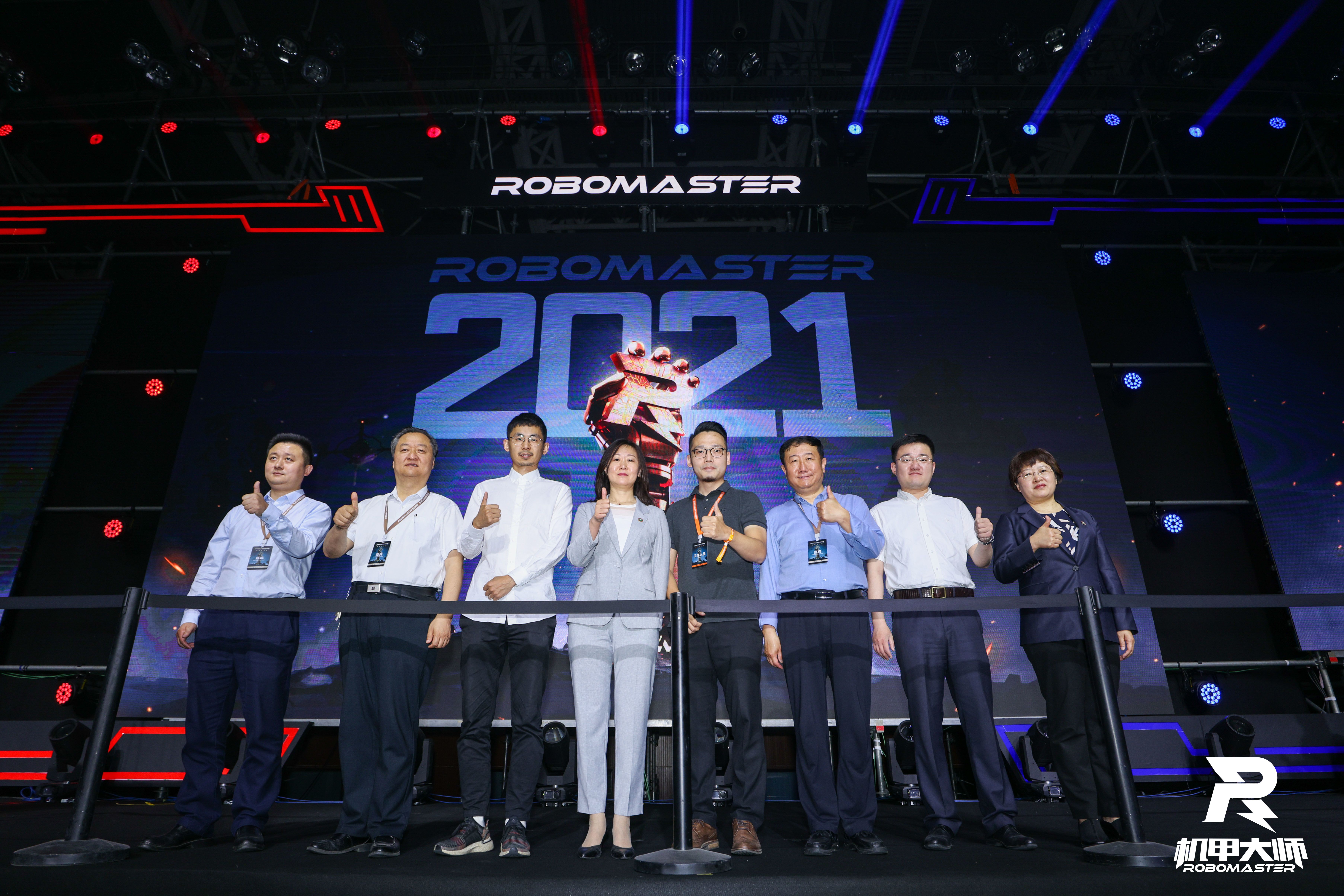 最后,与会嘉宾共同上台,启动第二十届全国大学生机器人大赛RoboMaster 2021机甲大师北部分区比赛并观看开幕式表演赛。